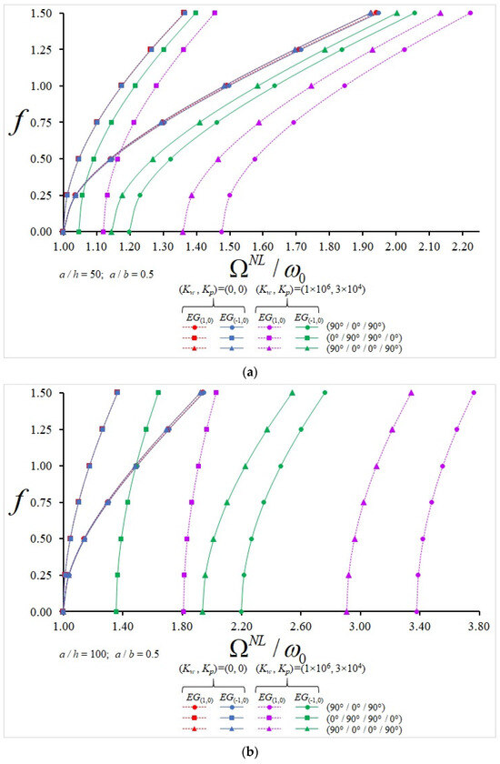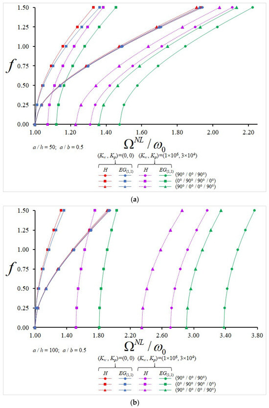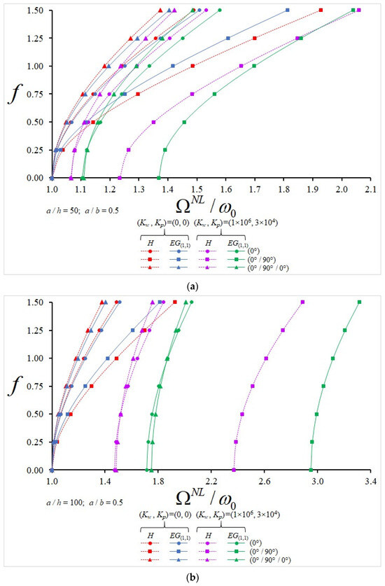 The distribution of the nonlinear frequency to linear frequency ratio (NLF/LF) for single-layer and laminated plates composed of H, EG(1,1), EG(1,0) and EG(−1,0) profiles with and without elastic ground against the f with different numbers and sequences of layers are plotted in Table 5 and Table 6 and in Figure 3, Figure 4, Figure 5 and Figure 6 for different a/h and when a/b = 0.5. Since the NLF/LF ratio is the same for EG(1,1) and EG(1,0) profiles, the same column is used in the tables. Although it is seen that the NLF/LF ratio increases when the f increases in plates starting from (0°/…) or (90°/…) array layers, in cases with and without ground, that ratio increases more clearly in some aligned plates in the case with ground.