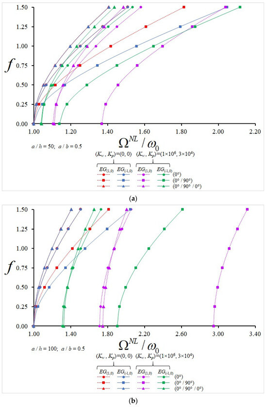 - At a/h = 50 and f = 0.25, the influences of EG(1.0) and EG(−1.0) profiles on the NLF/LF ratio for plates with (0°/90°) alignment are 9.92% and (−6.75%); in the plates arranged in (0°/90°/0°), those effects are 4.17% and (−2.07%); in the plates arranged in (0°/90°/90°/0°), those influences are 4.64% and (−2.18%); in the plates arranged in (90°/0°/90°), those influences are 12.17% and (−8.1%); and in the plates arranged in (90°/0°/0°/90°), those effects are 10.15% and (−6.4%), respectively.