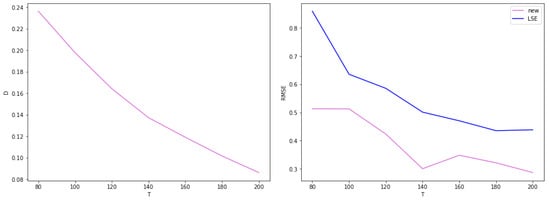 In Table 7, we display the D and RMSE of the new estimator. The new method performs well on the time-series model with a trend. Figure 6 shows that D decreases with an increase in T; this means that the grouping is more and more accurate. Further, RMSE decreases with an increase in N, which means that the estimates are improving.