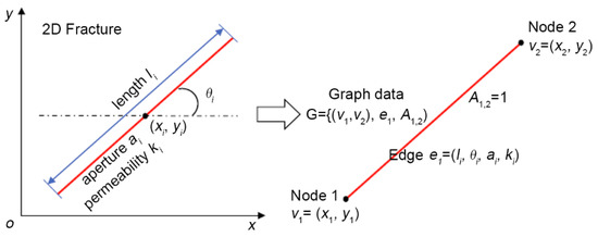 The characterization of the fracture network G is based on properties of each fracture. Fractures are discontinuous in reservoir space. Therefore, the characterization of the fracture network is non-structural. Graph learning is an effective method to deal with unstructured data. For graph learning, we first need to represent the fracture network to the graph data . As shown in Figure 1, there are nodes and edges due to each fracture having two nodes (the endpoints of the fracture) and one edge, where the node set V includes the end coordinates of all fractures , the edge set E includes the edge attribute , and is the adjacency matrix, denotes the existing edge from node j to node i, otherwise, .