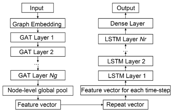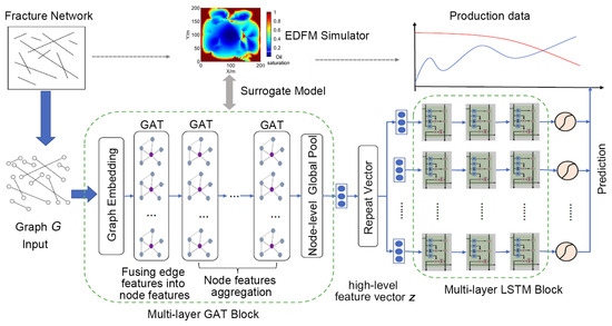 Figure 4 summarizes the flowchart of the proposed GAT-LSTM model. In the first GAT layer, edge features are transferred to node features to achieve the fusion of edge features. The number of GAT layers Ng and the number of LSTM layers Nr are two hyperparameters of the model, which are set according to the specific reservoir simulation problem.