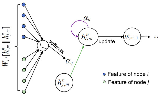 where represents transposition and is the concatenation operation, and are learned weight parameters, LeakyReLU [29] is the activation function, and are the dimensions of the inputs and outputs of the layer. These attention scores are normalized across all of using the SoftMax function to compute the attention coefficient: