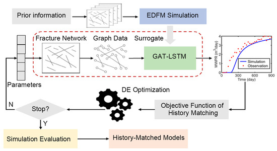 Figure 5 presents the proposed surrogate-based inverse modeling workflow for naturally fractured reservoirs, which consists of three phases. Firstly, initial realizations are generated by utilizing prior information, and a dataset is constructed using the EDFM numerical simulation for training the GAT-LSTM model. In this work, the EDFM simulation is conducted using the MATLAB reservoir simulation toolbox [31,32]. Secondly, the trained surrogate model is combined with the differential evolution (DE) algorithm to estimate uncertainty parameters and EDFM simulation is not necessary for this process. The uncertain parameters of the fracture network consist of geometry parameters, such as length, direction, and location, as well as some statistical parameters. The distribution of these uncertain parameters is non-Gaussian and high-dimensional, and the population-based DE algorithm is well-suited to handle such problems. Finally, the solutions obtained by DE are evaluated by EDFM simulation to obtain the final history-matched models. This step requires a small number of numerical simulations. In the following, we present the details of the history matching objective function and DE algorithm.
