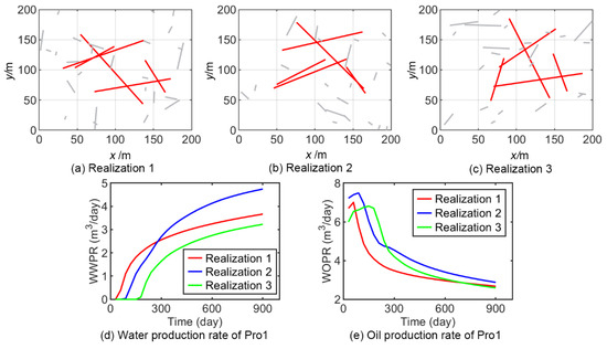 Three prior realization of the fracture network and their corresponding production data. In (a–c), the red lines represent large-scale fractures and the gray lines represent small-scale fractures.