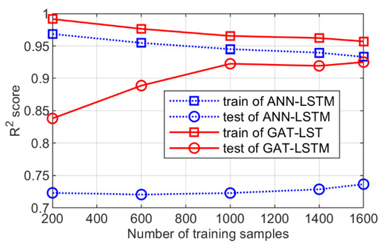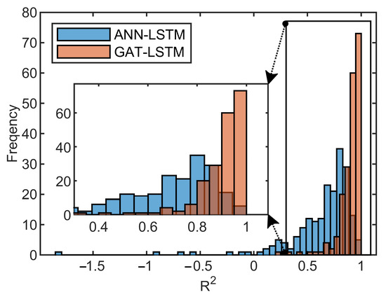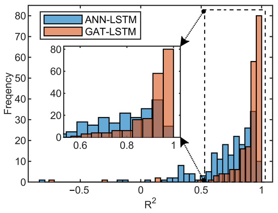 Moreover, for a more detailed comparison, the ANN-LSTM and GAT-LSTM models, trained with 1600 samples, are employed in the following experiments. Figure 9 presents the change in the MAE loss function of the GAT-LSTM and ANN-LSTM models during the training process. It can be seen that the ANN-LSTM model is overfitting, and the loss function on the test set continues to rise after 20 epochs. For the GAT-LSTM model, the loss function converges smoothly after 80 epochs. Then, we analyze the prediction performance of the ANN-LSTM and GAT-LSTM models on the test set. Figure 10 shows the R2 distribution histograms of the ANN-LSTM model and the GAT-LSTM model across 200 test samples. It can be seen that the R2 value of the ANN-LSTM model is negative for certain samples, and the R2 value of many test samples is below 0.8. In contrast, the GAT-LSTM model shows a concentration of R2 values between 0.8 and 1 for the test samples. Table 4 summarizes the proportion of test samples in the validation set with R2 values exceeding 0.8, 0.9, and 0.95, respectively. It can be seen that the prediction performance of the GAT-LSTM model is significantly better than that of the ANN-LSTM model.