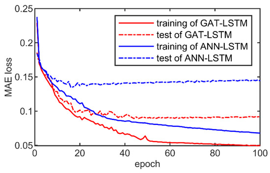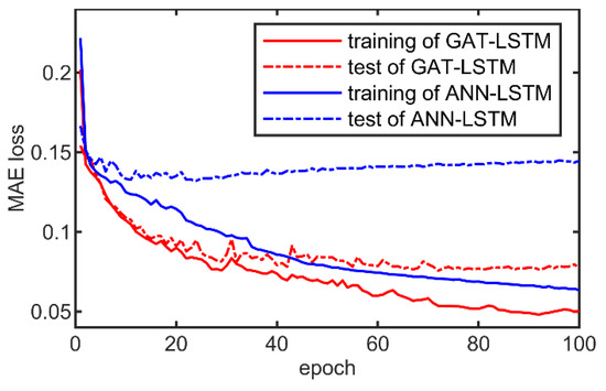 The evolution of the loss function during the training process of the GAT-LSTM and ANN-LSTM models.