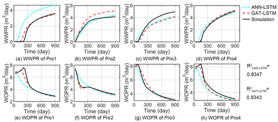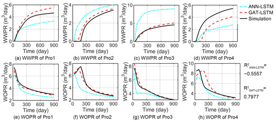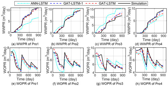 Figure 11 depicts the predicted results of production data for a selected test sample with a negative R2 predicted by the ANN-LSTM model. As observed in Figure 10, the negative R2 of ANN-LSTM is attributed to its oil production predictions for producer Pro2, which deviate from the trend of numerical simulation results. In the initial 300 days, the WOPR of the numerical simulation rises and falls, whereas the WOPR predicted by ANN-LSTM continues to decline. On the contrary, the GAT-LSTM model can predict the production dynamics more accurately. Particularly for Pro2 and Pro3, the trends of WOPR can be accurately predicted, although there is a large error in the production prediction of Pro4.