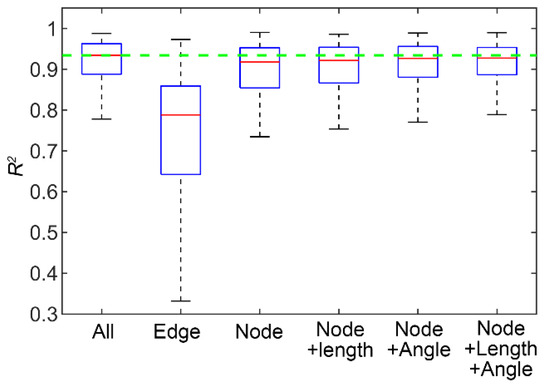 Afterward, we evaluate the sensitivity of the GAT-LSTM model to input data variability. To keep the model structure unchanged, we designate the input parameters to be masked with a value of 0. In this comparison, 1000 training samples were used. As shown in Figure 13, we test the model performance with different combination of input data. Taking the model performance obtained using all input parameters (All) as a reference (dotted green line), it can be seen that the model trained using only edge features (Edge) and ignoring the position features of the nodes cannot make the effective prediction. On the contrary, better model performance can be obtained by using only the location features of fractures (Node). This shows that the location of fracture is the key feature of the fracture network. This is due to the location of fractures determining the spatial distribution pattern of the fracture network. In addition, it can be seen that adding the length or angle features to the node features can enhance the prediction performance of the model. In this case, the aperture and permeability of fracture are proportional to the length, so no independent testing was performed. The comparison results show that the prediction performance of the model using all features is the best.