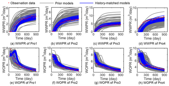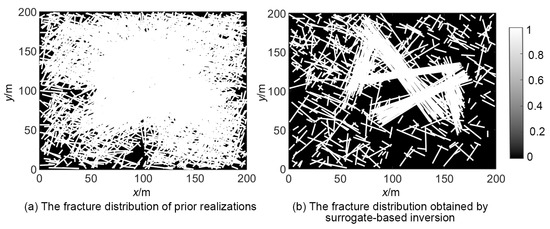 Finally, Figure 19 compares the fracture distribution probability plot of prior realizations with that of the history-matched models. It can be seen that the fractures of prior realizations (Figure 19a) are distributed throughout the reservoir region due to the large prior range of the uncertainty parameters. After the surrogate-based inverse modeling, the distribution of major fractures is corrected (Figure 19b), and four of the major fracture distributions are accurately predicted, but the predicted results of one major fracture distributions between well Pro3 and Pro4 are significantly different from the true model. This is due to the multiple solutions of history matching. By this comparison, it can be seen that the uncertainty of fracture distribution decreases significantly after inverse modeling.