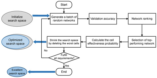 The optimization of the search space follows a structured process aimed at refining the selection of cells to improve network performance. The optimization process of the search space follows the steps of Algorithm 1: Firstly, various networks are randomly generated at the beginning of an exploration phase within a vast search space predefined by a human. Then, the performance, such as accuracy, of all generated architectures is tested and these architectures are ranked based on accuracy. Next, these architectures are ranked according to accuracy to identify the best performing architecture. A key step is to select the top k architectures and analyze how often each cell is used in all the architectures as well as in the top architectures. This analysis helps to calculate the effectiveness probability of each cell, defined as the ratio of the number of times a cell appears in top architectures to its overall usage rate. This effectiveness probability serves as a clear indicator of the cell’s contribution to improving the model performance, with higher values indicating a greater impact on improving accuracy. Subsequently, the cells with the lowest effectiveness probability are removed and those that are more effective are retained. Finally, the decision to conclude the optimization process depends on the size of the search space. If the search space has been reduced to a reasonable range, the optimization process is complete; otherwise, the process is restarted until the search space reaches an ideal size. This adaptive approach to shrinking the search space optimization can reduce labor and time costs while retaining superior units to improve search efficiency. The search space optimization process is shown in Figure 3.
