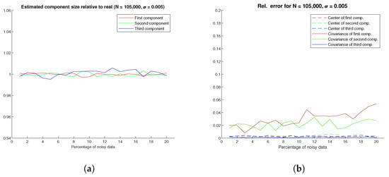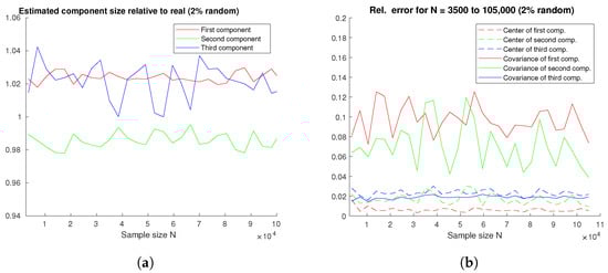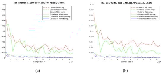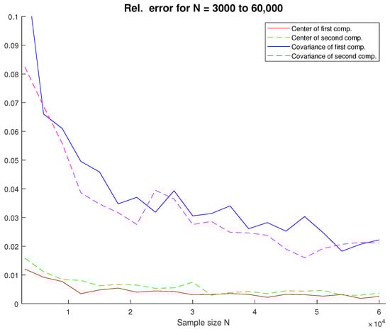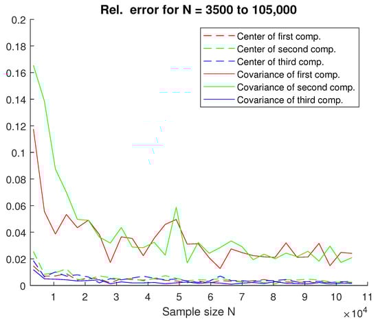The total sample size N varied from 3500 () to 105,000 ( = 52,500, = 37,500, = 15,000). Each experiment was repeated 100 times, and Figure 6 depicts the mean relative errors calculated as in (13) using the Euclidean norm for centers. The centers are well estimated even for very small samples, as well as the covariance of the smallest (third) component. A slightly larger sample is required for accurate covariance estimation for components with larger proportions of weight. Still, a total sample size of ≈100,000 is still significantly smaller than the traditional PET measurement size.