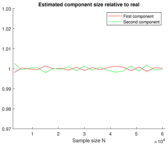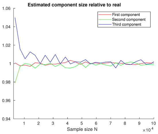 where was calculated as in (11). The criterion for stoppage was that each component weight changed by less than 10 between iterations. Note that the algorithm performed only a few (approx. 4–5) iterations each time before there was virtually no change in component weights. Figure 5 shows the ratio of relative and actual component sizes , calculated as an average over all simulations for each sample size. Clearly, component weights are well estimated regardless of the total sample size.