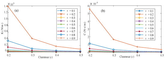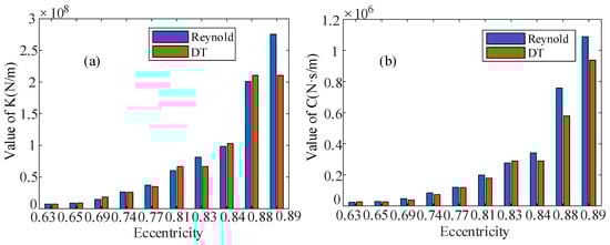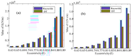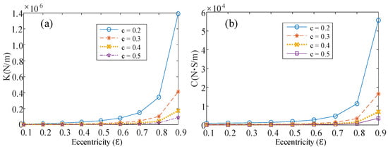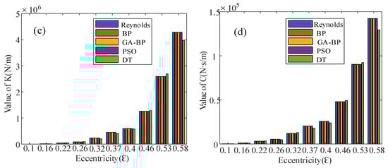 In the above Reynolds equation and the above neural network predictions, since the rotational speed has no effect on the damping, the model has limitations on the prediction of damping. Therefore, this section focuses on the prediction of stiffness and damping according to different eccentricity (
