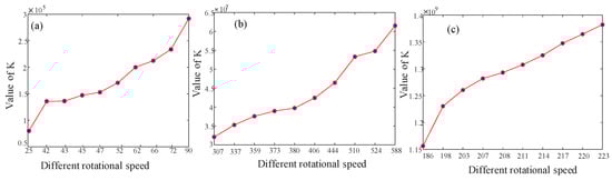 c) levels when the rotational speed is constant. The stiffness and damping prediction results of each model with Case 1 and Case 2 are shown in