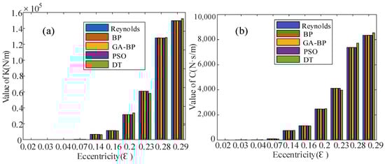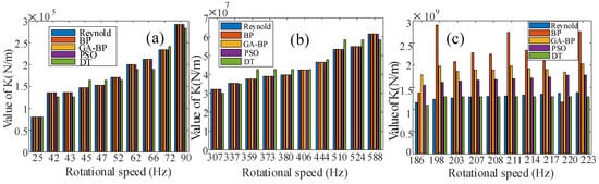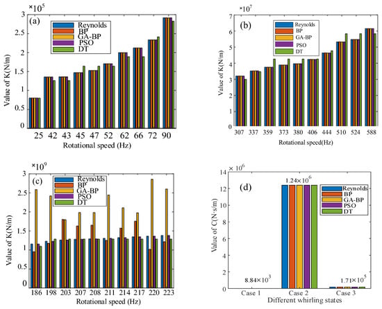 Figure 15. It can be seen from the figure that the stiffness prediction results of BP and its improved model in Case 1 are highly consistent with the results of the Reynolds equation. The result of the decision tree in Case 2 is better than that of PSO. But the PSO results in Case 3 are highly consistent with the results of the Reynolds equation. According to the comparison of the prediction results in the three cases, the neural network model shows that the rotational speed and eccentricity have a significant influence on the stiffness of SFDs, which is consistent with the analysis results of the Reynolds equation. Since the stiffness prediction is only carried out for different rotational speeds, the damping calculation in the Reynolds equation does not involve the rotational speed. Therefore, the damping result error is very small when the four methods are used to predict the results.