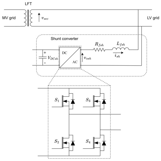 On the low-voltage side, a voltage source converter is connected in parallel to the grid with the ability to control power flow, which aims to compensate for the reactive power consumed by the loads, so the LFT receives only active power consumption. Additionally, the converter is tasked with controlling the DC link voltage to maintain the load levels at the configured values. This converter uses an L filter to connect it to the grid, which allows for a sinusoidal current output.