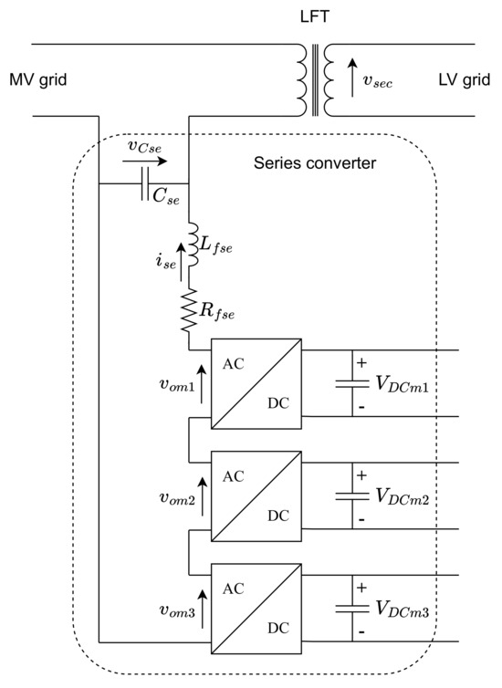 On the medium-voltage side of the LFT, a cascaded multilevel converter is connected in series to the grid and transformer through a LC filter as shown in Figure 4. The objective is to compensate for the voltage provided by the grid to maintain the voltage on the low-voltage side within the nominal values when variations in the voltage coming from the grid occur.