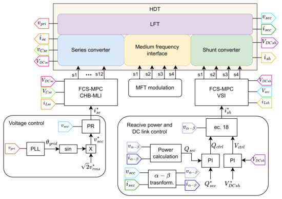 In [18], a back-to-back converter with a DC link powered by PV energy operates on both sides of the transformer. In this case, a multi-layer fault-tolerant protection strategy for HDT-PVs is analyzed. In [19], a quasi-proportional-resonant control is presented for an HDT composed of a converter on the low-voltage side of the transformer connected through auxiliary windings; this system enables voltage control in loads during variations and compensates for current distortions. In [20], an improved HDT topology is presented, consisting of a converter connected on both sides of the transformer. On the medium-voltage side, a series-connected converter is connected to the grid, while on the low-voltage side, another converter is connected to an auxiliary winding. Both converters share a DC link, and this HDT features a compound controller, which enhances system robustness while mitigating voltage and current variations, both in cases of symmetry and asymmetry. Another HDT configuration is presented in [21], where a double connection to the transformer is established. A series-connected converter is attached to the higher-voltage side, while a parallel-connected converter is on the lower-voltage side; this configuration aims to reduce current distortion reaching the transformer by compensating for the current delivered by the converter. This proposal utilizes a discrete-time LQR control, enabling the HDT to contribute to voltage sag and swell control, power factor correction, and current and voltage distortions.