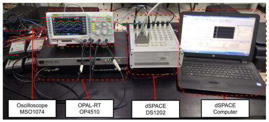 The results were derived from a Hardware-in-the-Loop (HIL) setup, utilizing the MicroLabBox Compact prototyping DS1202 unit from dSpace GmbH (dSPACE, Paderborn, Germany) to implement digital control and the OP4510 real-time digital simulation platform from Opal-RT (OPAL-RT Technologies Inc., Montreal, Quebec, Canada) to simulate the HDT power system. The set-up can be seen in Figure 7.