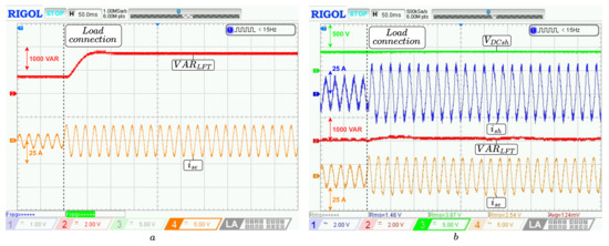 The HDT results are shown in Figure 8b; here, it can be seen that in the start, the reactive power is around 0 VAR because the shunt converter is compensating for the reactive power consumption, and when the change is made, the converter and secondary side LFT current increase since the load consumes more energy and more reactive power compensation is needed. The DC voltage is maintained at 400 V and is widely affected by the charge. The reactive power goes up to 200 VAR, but 400 ms after the connection is reduced by the control to around 100 VAR, so the control generates a 1600 VAR compensation in contrast to the LFT performance.