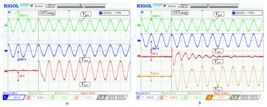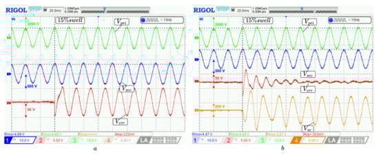 The final test presents the transformer performance under a 15% voltage swell. In Figure 10a, the LFT results show a similar behavior to the sag result; in this case, the 15% swell is seen on the secondary side of the LFT, and an error of 45 V is present again, the difference being that the error phase can be seen in a 180° phase, which means the voltage is over the reference value.