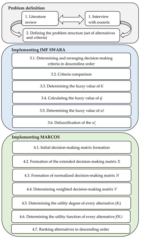 Step 4: Assessing and ranking alternatives occurs by using the MARCOS method. The implementation steps of the method (4.1–4.7) are elaborated in more detail below.