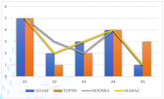 In addition to the sensitivity analysis, model validation was conducted to assess whether there would be a change in ranking if other MCDM methods were applied instead of the MARCOS method. For this purpose, the presented case study was solved using the ADAM (axial-distance-based aggregated measurement), TOPSIS, MOOSRA (multi-objective optimization on the basis of simple ratio analysis), and MABAC (multi-attributive border approximation area comparison) methods [37,38,39]. The rankings obtained from these methods are illustrated in Figure 8. Based on the figure, it can be concluded that the ranking of alternatives changed only when the TOPSIS method was applied, where alternative 2 was ranked the highest. In all other cases, alternative 5 consistently held the best rank.