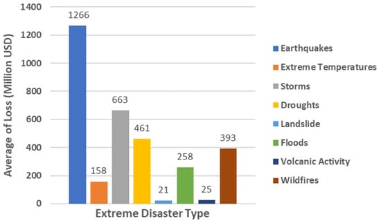 Extreme earthquakes are rare events and affect the economy and human life [1,2,3]. An analysis of data from the International Disaster Database (accessed on 28 October 2022 from https://www.emdat.be) shows that, on average, a single extreme earthquake results in economic damage of USD 1,266,348,909, with the highest magnitude compared to other extreme disasters, as illustrated in Figure 1. This high loss burdens the budgets of earthquake-prone countries (countries whose territories lie atop tectonic plate lines) [4,5,6,7], so several of them used traditional insurance mechanisms to obtain contingency funds for mitigation from 1992 to 2000. However, this mechanism generally has shortcomings, whereby the provided contingency costs pale in comparison to the actual losses incurred [8,9,10]. For example, earthquake insurance in Turkey in 1992 and Japan in 1993 provided contingency costs of USD 10.8 million (1.44% of actual losses) [11] and USD 16 million (1.6% of actual losses) [12], respectively. Therefore, to overcome this shortcoming, in the last three decades, earthquake-prone countries have attempted to develop traditional earthquake insurance mechanisms to be more effective in providing post-earthquake contingency costs [13,14,15]. So far, this development has established an earthquake insurance mechanism connected to financial instruments in the capital market. Simply put, investors receive a portion or the entirety of the earthquake risk associated with a country through financial instruments traded on the capital market. This is known as earthquake-insurance-linked securities (EILS).