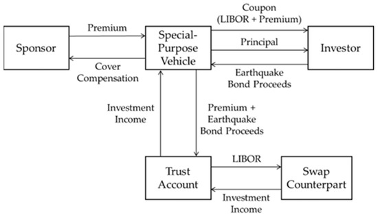 An earthquake bond is a type of earthquake insurance-linked security (ILS), where a sponsor, such as an insurer, reinsurer, or government, partially or fully offloads earthquake risk onto investors in exchange for elevated yields. This risk transfer is done by establishing a special purpose vehicle (SPV), which protects the sponsor and raises funds by issuing bonds to investors with a term of one to five years [43]. The SPV acquires bond and premium proceeds from investors and sponsors, respectively. Then, the SPV allocates them to secure financial instruments, such as Treasury bonds, and deposits the proceeds into a trust account. The proceeds are typically exchanged for variable returns linked to the London Interbank Offered Rate (LIBOR) provided by a reputable counterparty engaged in swap transactions. The purpose of the swap is to protect the sponsor and investors against potential risks associated with interest rate fluctuations and the possibility of default [44]. Supposing that the covered event does not occur within the specified period of the earthquake bond, investors will be reimbursed their original amount and additional compensation for their exposure to catastrophic risk. In the event of an earthquake risk event with predetermined conditions, the SPV will compensate the sponsor, leading to partial or complete principal repayment to the investors [45,46]. The earthquake bond structure explained in this paragraph is visually summarized in Figure 2.