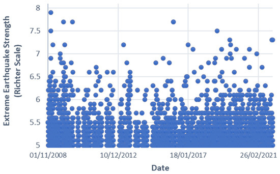 We obtained data on the strength and frequency of extreme earthquakes from the National Disaster Management Authority (BNPB) of the Republic of Indonesia from 2008 to 2021. We use a threshold value between extreme and inextreme earthquake strengths of because earthquakes with strengths above this value cause significant damage. Data on the strength of extreme earthquakes were collected daily from 1 November 2008 to 31 December 2021 (4808 days). Meanwhile, data on the frequency of extreme earthquakes were collected annually from 2008 to 2021. Visually, data on extreme earthquake strength and frequency are given in Figure 3 and Figure 4, respectively. Statistical descriptions of both are given in Table 2. Table 2 shows that the means of strength and frequency of extreme earthquakes in Indonesia are 5.3452 (Richter scale) and 258.5 extreme earthquakes per year, respectively. The standard deviations are 0.3794 and 119.16488 extreme earthquakes per year, respectively. In one year, there are 596 extreme earthquakes on average, while the highest extreme earthquake strength is 7.9 .