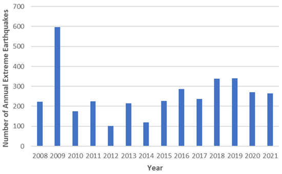 Annual frequency of extreme earthquakes from 2008 to 2021 in Indonesia.