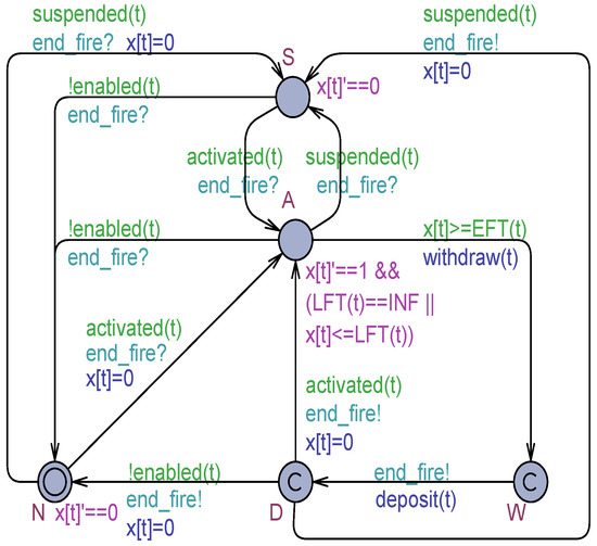 The firing process of a transition t is ensured using the global shared broadcast channel . In particular, the transition that is completing its firing sends in sequence two synchronizations over the channel. The first one is following the withdrawal sub-step and entering the location. The second one is when exiting the location, that is, after the deposit sub-step was executed. All the remaining transition instances in the model can hear each signal and adjust their state accordingly. For instance, a transition in that finds itself (newly) enabled can reach either or depending on its constraint function. In both of the two cases, its clock is reset as required. But a transition in or can come back to as soon as it becomes disabled, or it can move from to or from to if the transition, respectively, is suspended or activated by its constraints. Finally, the transition that is completing its firing can move from to or , or from to if (according to single-server semantics) it is still enabled after the current firing, or if it finds itself disabled.