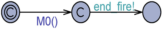 A critical point in Figure 2 is the enforcement of the atomicity to the transition firing. Toward this, the two locations and were realized as committed locations, which are exited without time passage and certainly before any other transition can start its own firing process. For instance, Uppaal guarantees that even a transition in whose clock arrived at its last time and, therefore, its invariant is up to be falsified would the time advance even of an quantity, and has less urgency than the exiting from a committed location, which does not increase the model time.