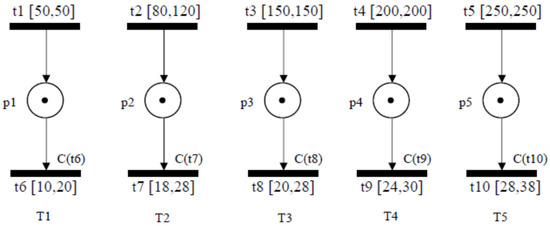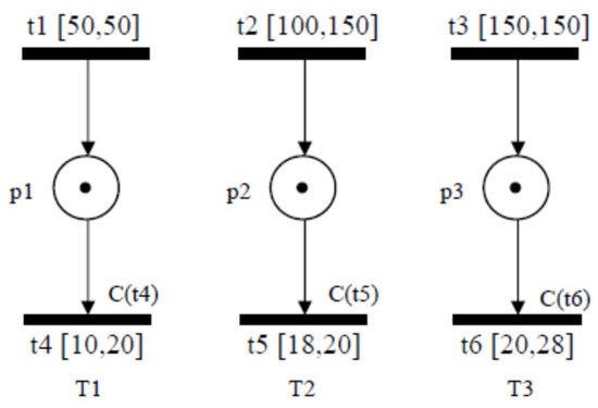 - Lime, D.; Roux, O.H. Expressiveness and analysis of scheduling extended time Petri nets. In Proceedings of the IFAC 2003, Singapore, 11–14 November 2003; Volume 36, pp. 189–197. [Google Scholar]