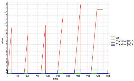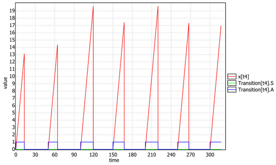 As one can see in Figure 2, in the location, the clock of this transition is allowed to grow by specifying, in the invariant of the location, that its first derivative is 1: . Similarly, in the location, the clock is stopped by putting its first derivative to 0: . The full invariant of the A location states that the transition can remain there provided the clock is within the interval [EFT(t),LFT(t)]. In the case that the upper bound is infinite, the transition can stay in for an arbitrary amount of time. The EFT(t) and LFT(t) functions simply return the interval bounds of t stored in the matrix . The blocking of in is a matter of simplicity, to help the visualization of results during the use of U-SMC (see later in this paper).