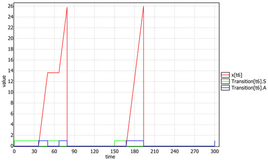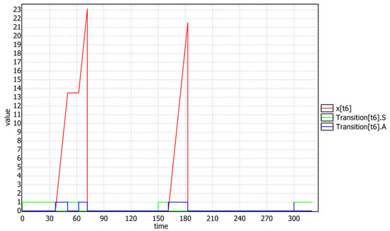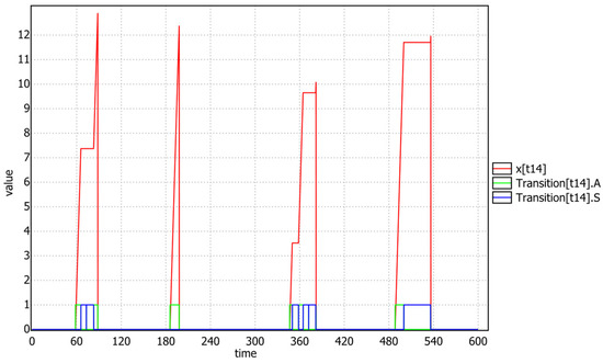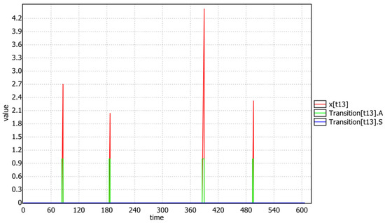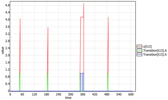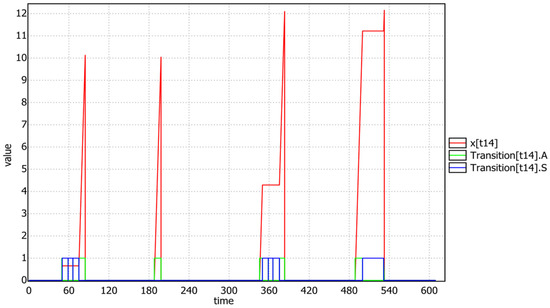 Figure 13 confirms, after a simulated query with a time limit of 600, that the transition t13 of task T3, once the mutex p8 was acquired, always runs to completion without suspensions, because it (due to the emulated priority ceiling protocol) holds the highest priority of T1. Instead (see Figure 14), after exiting the critical section (i.e., t13 fired), task T3 re-gains its low priority and the t14 transition can be affected by preemption and suspension.