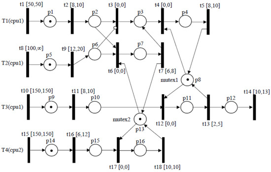 The T1 task body consists of t2, t3, t4, t5, t6 and t7 timed actions. Task T2 generates, with its t9 transition, a message toward T1. Without such a message, T1 could execute the t3, t4 and t5 (see the inhibitor arc from p6 to t3) actions. With a message pending in p6, the T1 task instance will execute a different control path modeled by transitions t6, t7, t4 and t5. The model tasks’ behavior is controlled by two mutex objects: p8 and p13. Executing t5 or t13 requires first acquiring the mutex p8. Similarly for the actions t7 and t18, which need the mutex p13. Under priority-based scheduling, the task set assumes that mutex objects are realized according to a priority ceiling protocol [3]. Therefore, the lower priority T3 task, after having gained the p8 mutex, immediately raises its priority to that of the highest priority task, which can require the mutex, in this example, T1. T3 reacquires its low priority at the exit from its critical section. No change of priority is required between T1 and T4, which have the same highest priority and run on distinct cpus, after acquiring the p13 mutex.