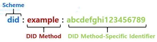 The structure of a DID is a string consisting of three essential parts: a URI scheme identifier (e.g., “did”), an identifier for the DID method (e.g., “example”), and a unique identifier specific to the DID method (e.g., “123abc”) (Figure 1). This configuration (e.g., “did:example:123abc”) is consistent with web standards and makes it easy to use on a variety of platforms. DID methods define how DIDs and their corresponding DID documents are created, interpreted, updated, and deactivated.