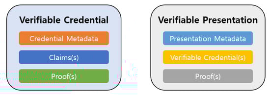 Verifiable credential (VC) is a data object that contains the user’s identity information, such as a driver’s license or graduation certificate, and is a trustworthy identity information object that can prove one’s qualifications digitally. As shown in Figure 2, VC is largely composed of three items: Credential Meta, which contains metadata about the VC such as issuing agency and expiration period, Claims, which is the information item that the user wants to prove, and Proof, which is used to verify that the VC is trustworthy.