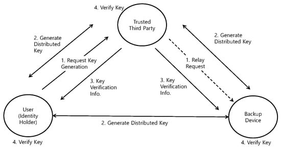 Figure 3 below shows the process in which the User, TTP, and Backup Device generate and store distributed keys for the critical signature. At this time, TTP plays a leading role and relays communication between the User (=Identity Holder) and Backup Device. A brief description of each procedure is as follows. When the User, the credential holder, requests a trusted third party (TTP) to generate a distributed key, all participants generate their own share and public key using FROST’s key generation and distribution protocol. In Figure 3, in Step 1, when the user requests TTP to generate a key, in Step 2, each participant has their share using the FROST key distribution protocol. In Step 3, information to verify the received shares is received, and then verification is performed in Step 4.