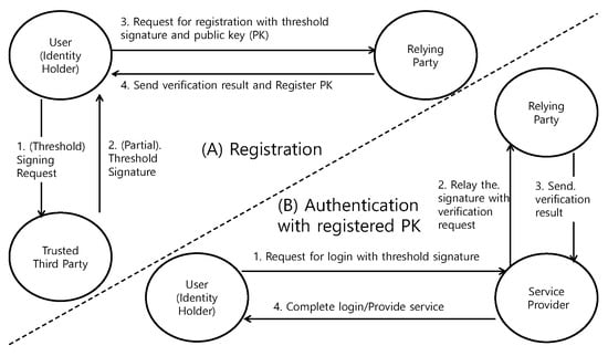 In the authentication process (B) using the registered public key, in Step 1, the User sends a login request message including the User’s threshold signature to the SP (Service Provider) who wants to log in. The signature creation process is assisted by TTP. The SP delivers the request message to the RP, and the RP verifies the threshold signature in the request message with the registered public key and then delivers the result to the SP. When verification is successful, the SP delivers a login success message to the User.