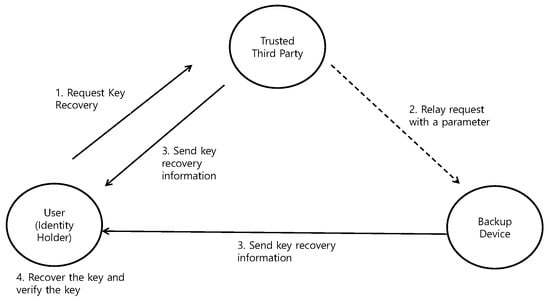 Figure 5 below shows the procedure for Users to recover their keys if the distributed key is damaged or lost. TTP, which received the request message in Step 1, forwards the request to the BD (Backup Device) and delivers the recovered key to the User through the protocol proposed in Section 4. Step 3 in Figure 5 means performing the protocol in Section 4.
