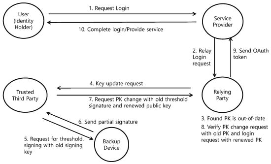 Under the above assumptions, the proposed public key change and destruction protocol operates as shown in Figure 6. In Step 1, 1∼3 represents a normal login request and failure process. Since the RP has an old public key, authentication cannot succeed because the signature verification process fails. In this case, if the key ID in the request is different from the key ID stored when registering the public key, the RP recognizes that the key has been updated and sends a public key renewal request to the User to the TTP (Step 4). Upon receiving this request, the TTP cooperates with the Backup Device to create a verifiable threshold signature for the key renewal request message with the old public key (Step 5∼6), and delivers the generated message, signature, and the User’s new PK to the RP (Step 7). The RP verifies the signature with the currently registered PK and updates it with the newly delivered PK when verification is successful. Afterwards, the login request received in Step 2 is verified with the updated PK, and if verification is successful, a login success message is delivered to the User as in Step 10.