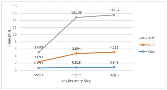 The verification results for the key recovery protocol based on the FROST signature algorithm are as follows. Among various (t, n) threshold settings, we perform computation comparison for (2, 3) threshold settings, which can be compared with related work [,]. Our experimental results were performed 100 times, and Figure 7 is a graph comparing the average of the execution time with the experimental results of related studies. The time required, which is a data label, is the accumulated value of the time required for each step.