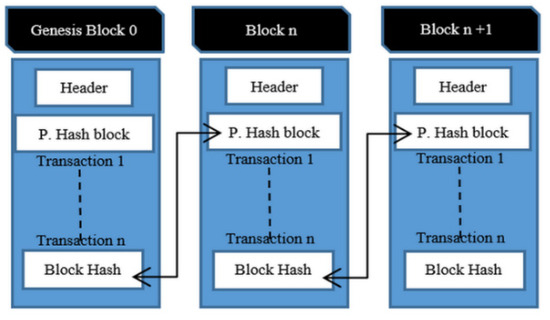 A blockchain consists of interconnected timestamp blocks in a peer-to-peer network. The blocks hold information according to the type of blockchain network. Blockchain is a digital ledger that can hold any type of data. Every block in a blockchain is a timestamp that is attached in chronological order. A timestamp is generally present in the header of the block. The first block is called the genesis block, and its block number in the chain is zero. The interconnected block mechanism, also called chaining in the blockchain, and is obtained using the cryptographic hash function [24]. Figure 1 shows the general chaining of the blocks in the blockchain. Every block has its previous block hash in the header, such that it creates a digital chain structure. Every node in the blockchain maintains a copy of its ledger. When a new block is created, it is broadcast to the entire network and every node updates its ledger by adding new blocks.