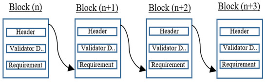 The staking details of validators are very important. In a majority of PoS-based blockchain networks, block producers are the core part of the consensus. At some point, blockchain network security relies on their hand. They produce blocks and verify transactions in the network. The selection of block producers is mostly held by using their stake details. These details are a very critical part of the complete consensus process. We have seen that coin/amount staking plays a very important role in all PoS-based consensus mechanisms, such as in Table 1, which describes the staking amount requirements in the system. Therefore, the stacking details should not be tempered, altered, or deleted from the network. The details should also be available to all required ones. Hence, we present Sea Shield as a blockchain use case that uses a validator chain with a consensus mechanism. The proposed consensus mechanism saves the node’s information with all of the staking details when joining/unjoining as a validator in the network by a process flow. The join and unjoin process of the nodes as validators in the Sea Shield is completely transparent and the details are known by all of the nodes in the network. Normal computing environment infrastructure emphasizes confidentiality and integrity whereas blockchain is designed to offer integrity and availability on a decentralized distributed system. We used blockchain technology to save records because security in the blockchain is based on ensuring that data are protected from alteration. To restrict the data from modification, the technology copies the data to as many locations as possible so that the modification of all copies becomes infeasible. The validator chain works similarly to other blockchains. This is mainly the use case of blockchain technology. Figure 3 shows the chain of blocks for the validator blockchain.