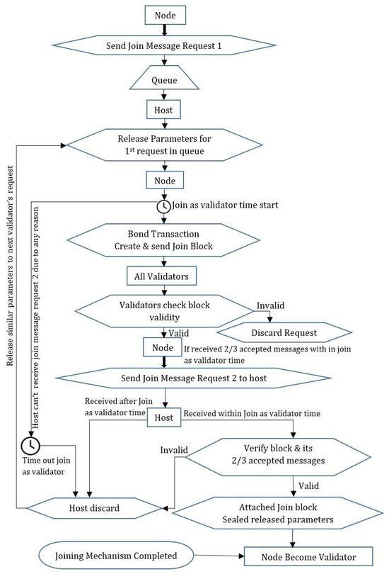We designed the process for the PoS-based public permission blockchain system, in which anyone can join the network and create transactions; however, to participate in the block creation and finalization process, the node first needs to become a validator node. We presented a mechanism by which a node can become a validator node. When a node wants to become a validator node in the network, it must follow the joining mechanism. Figure 4 shows the process flow of the joining mechanism of a node to become a validator in the network.