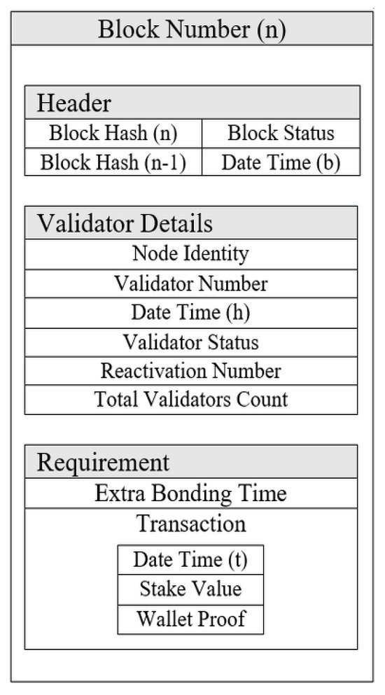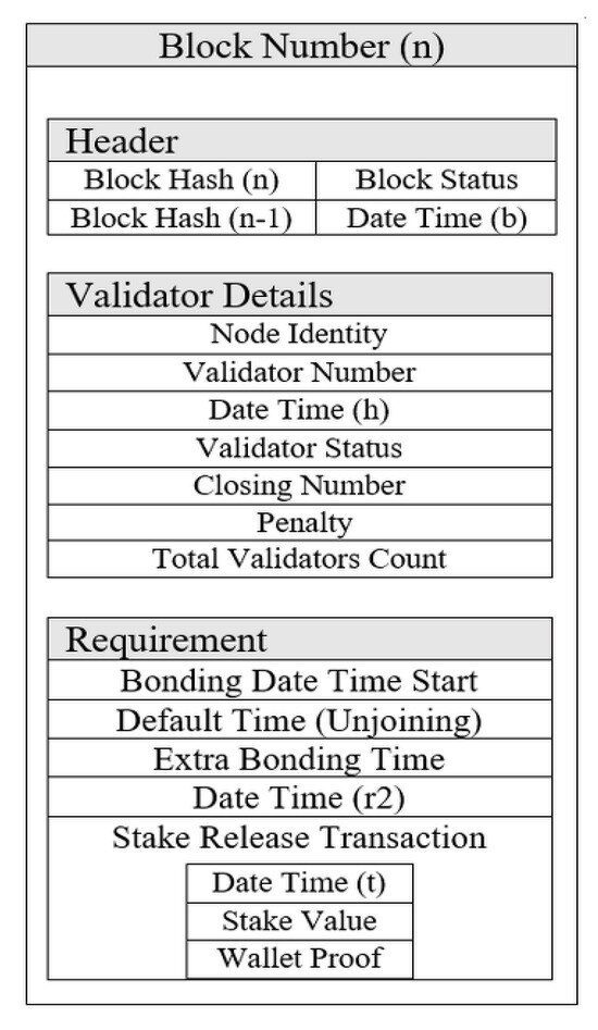 Where the Block Number, Hash (n − 1), Validator Number, Date Time (h), and Total Validators Count are issued by the host. Block Hash (n) contains the hash of the current block. Block Status shows the block is created for “join as validator”. Date Time (b) is the date and time when a node creates a block, and Node Identity is the identity of the node in the network, such as its wallet address [51] or any other address. Wallets are used to store the user’s credentials and all of the account-related information of the user. In the blockchain, the wallets keep track of all assets of the user. It also holds the private [52] and public [53] user keys. Validator Status shows the validator’s current status; the block is for the joining mechanism whose status is active. Extra Bonding Time (m) is the extra time duration (in minutes) committed by a node in the block. A Transaction is a bond transaction from node. Date Time (t) is the date time of the bond transaction performed by a node to become a validator. Stake Value is a bond transaction amount, and Wallet Proof is proof of the transaction from the node’s wallet. The reactivation number is for the validators that were once validators but left their validators responsibility by performing the unjoin mechanism. If that node creates a block for the join mechanism as the validator, it inserts its total number of unjoins as validator counts in the reactivation number in the block. For a new node that first creates a block for the join mechanism as a validator, its reactivation number would be zero. If the old validator wants to rejoin the validator’s responsibility, it must fulfill the complete joining mechanism again to become a validator in the network, except for the validator number. The node uses its old validator number to create a new block for the join mechanism. Figure 5 presents the block structure in which the node is used to create the new join block for the validator’s chain to become a validator in the network.