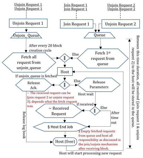After passing the bonding time in the network, the validator creates an unjoin message request 2 and sends it to the host and other validators to inform them of the completion of their bonding time. Unjoin message request 2 comprises (Bonding time start + total bonding time duration + Bonding time end). If the host is free, it responds to the validator’s request at the same time; otherwise, it maintains the queue to respond to the validator’s request. The host entertains each validator’s request by the receiving time either joining as a validator or unjoining as a validator, the host maintains the queue in FIFO (first in first out) fashion and responds with respect to the message arrival time of the requests. Figure 6 shows the process flow of requests received by the host during the join and unjoin mechanisms.