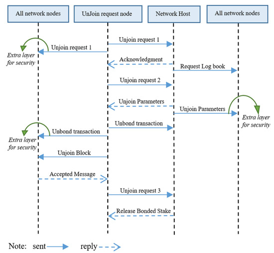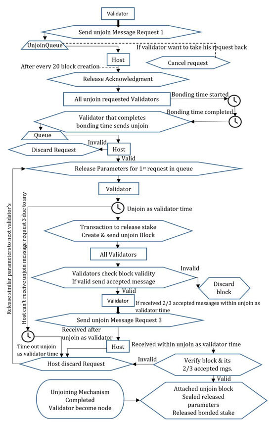 When a node wants to leave the validator’s responsibility in the network, it must follow the unjoin mechanism. To start the unjoin mechanism, the validator creates an unjoin message request 1 and sends it to the host and all validators/nodes of the network. The validator may send the unjoin request 1 at any time to the host but the host will only respond to the request after every 20 block creation cycles in the network until all requests are waiting in the unjoin_queue. A network may set any time duration to respond to unjoin requests; in our work, we set a 20-block creation cycle as the time duration. The validator may cancel its request before the host responds because the request becomes permanent after the host’s acknowledgment. The host collects all unjoin requests received from the validators during the last 20 block creation cycles. Before the start of the 21st block creation cycle or after every 20th block creation cycle of the network, the host acknowledges all of the requested validators that sent an unjoin request so that they can start their unjoin process. Once the host has sent an acknowledgment to the unjoin request, the validator cannot participate in any network process as a validator. The network host restricts the validators from participating in the consensus process as block producers or in the election process that had already requested to unjoin, by removing their IDs from the total validators list of the network at the time of sending an acknowledgment of their unjoin request.